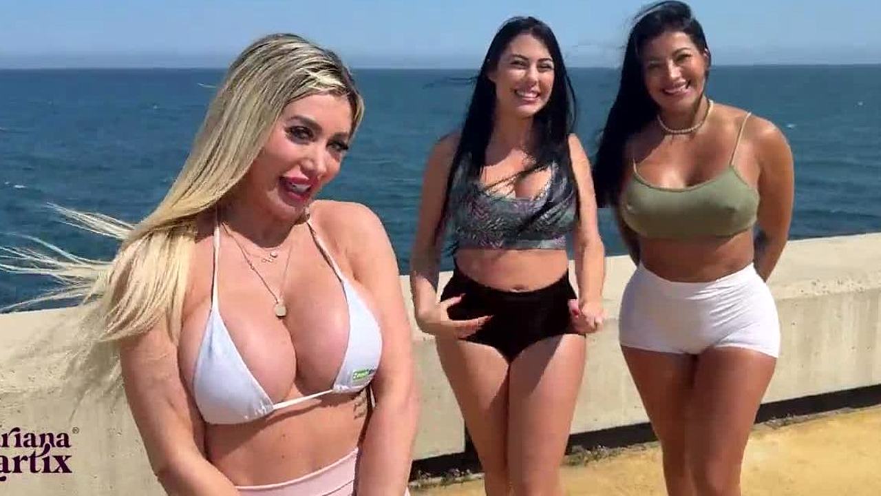 Join the foursome on the nudist beach with three busty blondes doing anal